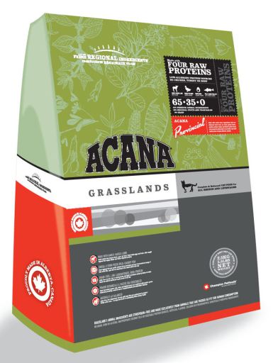 für 18.95€ kaufen ···· Miscota Poland, Czech Republic, Greece and Hungary - Online Shop for Pet Supplies Dry Food for Dogs Acana Grasslands (no grain) For Adult Dogs of All Breeds and Sizes\nReflecting Albertas fertile grasslands, Acana Grasslands is loaded with local lamb, whole eggs, wild-caught fish, and cage-free duck all delivered FRESH each day.\nAcanas fresh meat diversity copies your dogs natural diet, and mix with New Brunswick herring promotes his peak conditioning.\nGrain-free to reduce unwanted carbohydrates, Acana features local fruits and vegetables for a rich, natural supply of phytonutrients.\nPrepared in our award-winning kitchens from Canadas best and freshest ingredients, Acana keeps your dog happy, healthy and strong guaranteed!\n60% Lamb, Duck, Eggs & Fish\nThe ultimate food copies the diet that Mother Nature intended for your dog!\nConsists 60% of meat and fish, Acana Grasslands matches your dogs evolutionary adaptation to a meat & protein rich diet, and its fresh meat variety mirrors the diversity and freshness of the natural diet.\n Alberta Lamb ranch-raised and delivered fresh from local Alberta ranches\n Wild-Caught Fish our northern Walleye are locally caught and delivered fresh\n Free-run Duck our Canadian duck are raised free-run and delivered fresh each day\n Grade A Eggs delivered fresh and whole each day from local prairie farms.\n Passed fit for human consumption, our local ingredients are truly fresh so theyre never frozen and arrive preservative-free each day.\nFresh, Local Fruits & Vegetables\nAcana Grasslands is made of 40% of fruits & vegetables including Red Delicious apples from the sun-drenched Okanagan valley, butternut squash, Burbank potatoes and spinach greens from the black soils of local prairie farms all bursting with goodness to support superb health and immunity.\nGrain-Free & Low on Carbohydrate\nRich in protein and low in carbohydrates to match your dogs natural diet, ACANA Grasslands is free of high glycemic grains such as rice and corn.\nLong associated with obesity and diabetes, high glycemic grains break down quickly, causing a rapid and large rise in your dogs blood sugar.\nGrain-free and low in carbohydrates, ACANA causes your dogs blood sugar to rise less over a longer period of time so his sensitivity to insulin is beneficially increased and fat storage is decreased for peak conditioning.\nLuxuriant Skin & Coat\nWe infused each morsel of ACANA Grasslands with marine-source Omega 3 from wild-caught Canadian Walleye to support immunity and luxuriant skin & hair coat your dogs outer symbol of health and vitality.\nEnhanced Metabolism\nOrganic sea vegetables and botanicals including juniper berries, lavender flowers, sun-cured alfalfa and peppermint leaf enhance metabolism while nourishing and toning your dogs digestive tract.\nDesigned For Carnivores\nThey might look different, but your dog shares his anatomy with the grey wolf which means hes evolved as a carnivore and adapted for a diet rich in meat, protein, and fat.\nBased on this biological fact, and to produce a nutritional analysis that mirrors the diet Mother Nature would provide for your dog, ACANA is loaded with nourishing meat proteins and fats, while limiting unwanted carbohydrates and high-glycemic grains.\n Guaranteed Analysis\n Vitamins & Minerals\n Amino Acids\n Botanical Inclusions\nCaloric Content\nACANA mirrors the meat and protein concentrated diets that all dogs are evolved to eat, while reducing the carbohydrates and high-glycemic grains that cause blood sugar levels to rise and fluctuate.\nCompared to conventional foods, ACANA delivers more calories from protein and fat and fewer calories from carbohydrates, reducing the risk of obesity and diabetes and promoting your dogs peak health.\nMetabolic Energy for ACANA Grasslands Dog Food is 3529 kcal/kg (423 kcal per 250 ml cup) with 31% of energy from protein, 41% from lamb, duck and fish oils, and 28% from fruits and vegetables.\nYour Dog Is Special\nJust like you, your dog is a unique individual and his feeding requirements will vary with his breed, environment, age and activity.\nThats why we suggest using this chart as a starting point, and monitoring your dogs weight and adjusting his rations as needed. We also recommend feeding him twice daily and always keeping fresh, clean water available.\nWhen switching diets, its important to transition your dog as it takes time for his digestive system to adapt to the richer nutrient levels in ACANA. Over a 5-7 day period, gradually mix in ACANA, increasing the amount each day so that by day 7 you are feeding 100% ACANA.\nHell love the change we guarantee it!\nFeeding Guidelines\nWeight of Dog Active Less Active\nKG LBS GR/DAY CUPS/DAY GR/DAY CUPS/DAY\n5 kg 11 lb 90 g c 60 g c\n10 kg 22 lb 160 g 1 c 120 g 1 c\n20 kg 44 lb 280 g 2 c 180 g 1 c\n30 kg 66 lb 390 g 3 c 240 g 2c\n40 kg 88 lb 480 g 4c 320 g 2 2/3 c\n50 kg 110 lb 560 g 4 2/3c 360 g 3c\n60 kg 132 lb 640 g 5 c 420 g 3c\n Use a standard 8 oz. measuring cup. Serve dry or lightly moistened. See your veterinarian regularly. To help maintain freshness, we recommend sealing the bag tightly and storing it in a cool, dry location.\nACANA Grasslands is formulated to meet the nutritional levels established by the AAFCO Dog Food Nutrient Profiles for all life stages.\n ····· 104201246