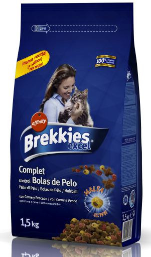 für 4.95€ kaufen ···· Miscota Poland, Czech Republic, Greece and Hungary - Online Shop for Pet Supplies Dry Food for Cats Brekkies Excel Complete Control Hairballs A delicious combination of high quality meat and fish to provide your cat with three essential health benefits as it helps maintain the urinary system, promotes a shiny coat and a healthy skin, as well as grow strong teeth and gums. And as it contains no preservatives or colours, Brekkies excel cat Complet is a natural way of giving your cat what it likes and needs.\nBenefits NutrientsPromotes good function of the urinary tract pH controlHelps maintain healthy skin and shiny coat Omega 3 and 6Contributes to maintain strong teeth and bones Calcium and vitamin D3\nHOW TO USEThe feeding quantities shown are for guidance only and may depend on factors such as age, breed, activity and weather conditions.Store in a cool dry place. Clean fresh water should be available in a clean bowl at all times.\n ····· 1042013774