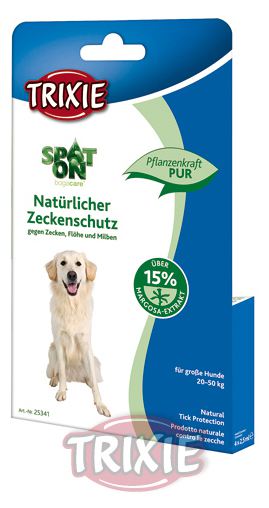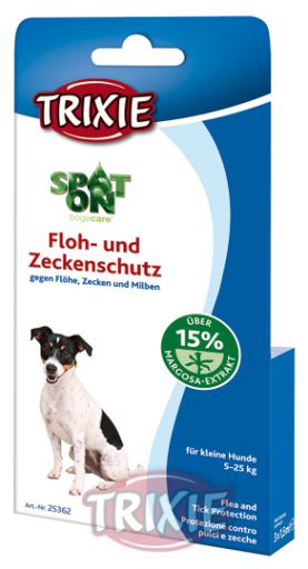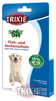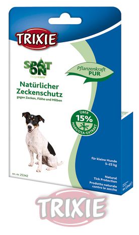 für 13.95€ kaufen ···· Miscota Poland, Czech Republic, Greece and Hungary - Online Shop for Pet Supplies Flea Collars for Dogs Trixie Spot-On, Repelente natural, Perr. Peq., 4 These items are biocidal products registered in Germany. \nImporters need to check regulations before sales in other countries are effected. \nSales in the UK are not possible due to a lack of registration\n -For dogs\n \n-Active ingredient: margosa extract (> 15 %)\n \n-Against fleas, ticks and mites\n \n -100 % plant-based active ingredients\n \n-To be applied directly onto the pet\nContents :4 × 1.5 ml \n \n ····· 104204481