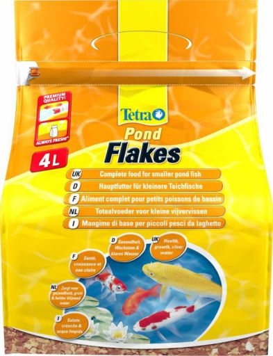 für 12.95€ kaufen ···· Miscota Poland, Czech Republic, Greece and Hungary - Online Shop for Pet Supplies Food for Pond Fish for Fish Tetra Pond Escamas -(flakes), 4l flake mixture comprising four types of flake for a varied, balanced and healthy diet\n the red flakes, with their high protein content, promote growth and vitality\n the yellow flakes contain a high proportion of vitamins and minerals, and prevent deficiency symptoms\n the brown flakes provide the fish with healthy plant nutrients\n the white fibre flakes promote digestion\n the high-quality resealable plastic bag protects the food from harmful effects such as sunlight, air and dampness. This means important ingredients are protected and the food is kept fresh, making sure your fish get the best possible nutrition\n ····· 104202952