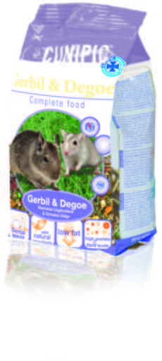 für 4.95€ kaufen ···· Miscota Poland, Czech Republic, Greece and Hungary - Online Shop for Pet Supplies Food Mixes for Small animals Cunipic Gerbil and Degoe A complete and natural food designed by clinical veterinarians and \nnutritionists specialising in exotic animals. Formulated with a low percentage of fat in accordance with the nutritional requirements of gerbils and degus. Its formula prevents cholesterol problems by containing fruit and vegetables but not seeds.\nInstructions for use: Approximately 5 - 7 grams per adult animal per day. Use with any variety of Cunipic hay to prevent obesity.\nMake sure that the animal always has clean fresh water available.\n\nAdvantages:\nDental ware\nRaw material for the proper abrasive tooth wear.\nNatural ingredients: \nThese natural ingredients faithfully reproduce the diet of these animals in the wild, thus improving digestibility and immune function, reducing disease and digestive problems.\nLow-fat \nFood made of low fat, avoids fattening animals and reduces disturbances.\nHigh protein and a good level of fiber, protein, rich quality and adequate levels of fiber to ensure reliable operation of the immune system, and works with the development of appropriate intestinal microflora.\nCuni-counsil\nThe degúes are prone to diabetes so avoid fruit in their diet and added sugars. We provide Vitamin C in the diet, with suitable food for them or vitamin supplement. Do not use fruit with vitamin C for its sugar content.\nThe Gerbils and Degoes should supplement the diet with small amounts of animal protein 2 or 3 times a week (egg, chicken breast, think of dog / cat) and vegetables (fruits and vegetables) varied.\n ····· 1042018877