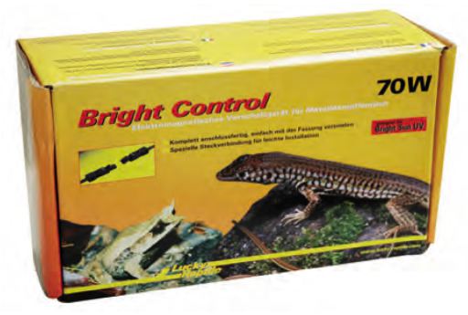 für 92.95€ kaufen ···· Miscota Poland, Czech Republic, Greece and Hungary - Online Shop for Pet Supplies Lighting for Reptiles Lucky Rep Bright Control Pro 70W The Bright Control PRO is an electronic ballast designed for optimal use with the Bright Sun UV lamps.\nAn electronic ballast should be preferred over an electromagnetic ballast as it is more efficient and increases the lamp life. It ensures a smoother operation and increases the effectiveness of the lamp. The spectrum of metal halide lamps will stay fairly constant during its life cycle when using electronic ballasts. Metal halide lamps that are used with an electromagnetic ballasts normally show significant changes in their spectrum especially at their end of life. Only an electronic ballast like the Bright Control PRO can ensure the best light quality.\nIn addition the Bright Control PRO will automatically shut off broken or not igniting lamps for safety reasons.\nFor the Bright Sun UV lamp we recommend the use of the electronic Bright Control PRO over the conventional Bright Control gear box to ensure best possible operation. Apart from the technical advantages it is also much smaller.\n ····· 104208818