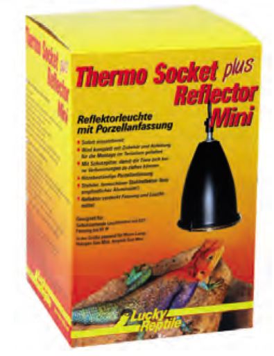 für 17.95€ kaufen ···· Miscota Poland, Czech Republic, Greece and Hungary - Online Shop for Pet Supplies Lighting for Reptiles Lucky Rep Thermo Socket C/Reflector Mini The popular Thermo Socket plus Reflector is also available as MINI Version, fitting for all Halogen Sun Mini, Amphib Sun Mini and the Moon Lamp.\nThe porcelain lampholder is completely covered by the reflector, ensuring a nice optical appearance. \nThe luminaire can be used for lamps up to 60W but regular spot lamps can stand out of the reflector so that the wire mesh guard cannot be fitted anymore.\nHalogen Sun Mini and Co. are fitting perfectly! ····· 104208825