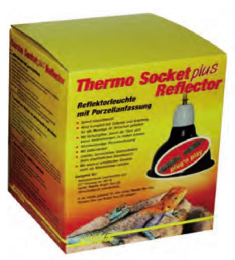 für 38.95€ kaufen ···· Miscota Poland, Czech Republic, Greece and Hungary - Online Shop for Pet Supplies Lighting for Reptiles Lucky Rep Thermo Socket C/Reflector S Conector These high quality reflector lamps have an E27 porcelain lampholder, a high quality steel reflector, wire mesh protector and a silicon power lead.\nThe steel reflector focusses the light and acts as sight protection, preventing from being blinded by the light. \nThe wire mesh protector is placed on the bottom of the reflector and prevents that the animals can get in contact with the bulb.\nThe lamps are shipped ready for use. \nMounting accessories for installation inside a terrarium are included but the lamp has to be taken apart for that. \nFor a more convenient installation inside the vivarium versions with connector are available. \nThese can be attached to a surface without having to be taken apart. \nIn addition the connector plugs directly into the Bright Control ballasts. Plug and Play!\nA clamp for use as clamp lamp is available separately.\nSuitable for light bulbs up to 300W. Two different reflector sizes are available:\nThermo Socket plus Reflector small: for all Halogen Sun and Bright Sun UV lamps as well as the Compact UV Sun.\nThermo Socket plus Reflector large: for straight engery saving bulbs and mercury vapour UV lamps\nAll versions are suitable for use with 300W lamps!\nAvailable with UK plug! ····· 104208826