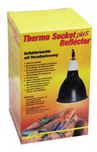 für 21.95€ kaufen ···· Miscota Poland, Czech Republic, Greece and Hungary - Online Shop for Pet Supplies Lighting for Reptiles Lucky Rep Thermo Socket C/Reflector Small These high quality reflector lamps have an E27 porcelain lampholder, a high quality steel reflector, wire mesh protector and a silicon power lead.\nThe steel reflector focusses the light and acts as sight protection, preventing from being blinded by the light. \nThe wire mesh protector is placed on the bottom of the reflector and prevents that the animals can get in contact with the bulb.\nThe lamps are shipped ready for use. \nMounting accessories for installation inside a terrarium are included but the lamp has to be taken apart for that. \nFor a more convenient installation inside the vivarium versions with connector are available. \nThese can be attached to a surface without having to be taken apart. \nIn addition the connector plugs directly into the Bright Control ballasts. Plug and Play!\nA clamp for use as clamp lamp is available separately.\nSuitable for light bulbs up to 300W. Two different reflector sizes are available:\nThermo Socket plus Reflector small: for all Halogen Sun and Bright Sun UV lamps as well as the Compact UV Sun.\nThermo Socket plus Reflector large: for straight engery saving bulbs and mercury vapour UV lamps\nAll versions are suitable for use with 300W lamps!\n ····· 104208824