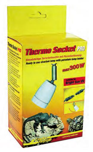 für 33.95€ kaufen ···· Miscota Poland, Czech Republic, Greece and Hungary - Online Shop for Pet Supplies Lighting for Reptiles Lucky Rep Thermo Socket Pro C/Bisagra Contrary to the simple Thermo Socket lampholder sets the Thermo Socket PRO are completely wired and ready for use. There are no electrical installations necessary.\nSpecial mounting accessories and a connector allow the terrarium installation without the need to take the lampholder apart.\nThe Thermo Socket PRO are also excellent for use with the Lucky Reptile Bright Sun UV lamps as their connector are compatible to the Bright Control ballasts which can simply be attached between lampholder and wall socket.\nThe power lead has a silicon insulation allowing the use of lamps up to 300W including the Osram Vitalux.\nOf course the Thermo Socket PRO are also compatible to the Lucky Reptile Reflector Sets.\nThe Plug and Play solution!\nMost Popular Model: with hinge! Lampholder can be directed as desired! ····· 104208823