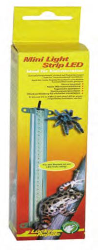 für 42.95€ kaufen ···· Miscota Poland, Czech Republic, Greece and Hungary - Online Shop for Pet Supplies Lighting for Reptiles Lucky Rep Mini Light Strip Led The Mini Light Strip LED is a 22,5 cm long, slim luminaire with modern LED technology. It only creates little excess heat and is very thin making it perfect for small terrariums as well as small plastic transport boxes like the Lucky Reptile Herp Haven. The Mini Light Strip LED are low voltage and protected against spray water and therefore can be safely installed inside terrariums.\nA transformer is necessary for operation and already included in the Mini Light Srip LED Set. One transformer can operate up to 5 Mini Light Strip LED. Additional Mini Light Strips for extension purposes are available.\nInstallation is easy thanks to connectors. Each single Mini Light Strip has an On/Off switch.\nEach Mini Light Strip LED only consumes 2W. The daylight spectrum is perfect for amphibians, invertebrates and snakes.\nAvailable with UK plug!\n ····· 104208842