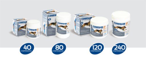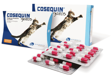 für 25.95€ kaufen ···· Miscota Poland, Czech Republic, Greece and Hungary - Online Shop for Pet Supplies Supplements for Dogs Bioiberica Cosequin Gatos 45 -Capsulas OSEQUIN Taste es un Condroprotector recomendado para perros y gatos con problemas articulares o con presencia de factores de riesgo de desarrollo de artrosis (sobrepeso, traumatismos, incongruencia articular, edad avanzada, ejercicio elevado, o después de cirugías articulares). Es el Condroprotector más adecuado para aquellos casos en los que coinciden varios factores de riesgo.Cada comprimido de COSEQUIN Taste contiene:Glucosamina HCl (pureza > 99%) 400 mgCondroitín sulfato (100% pureza) 300 mgColágeno hidrolizado (tipo II) 30 mgVitamina E 25 mgCON SABORIZANTE PARA PERROS Y GATOSDisponible en botes de 40, 80, 120, 240 y 500 comprimidos.El Condroitín Sulfato es un componente fundamental de la matriz del cartílago, y es el principal responsable de su correcta hidratación. Es básico para el mantenimiento de la elasticidad y flexibilidad de la articulación, minimizando la degradación de ésta.La Glucosamina aumenta la síntesis de componentes de la matriz por parte de los condrocitos, especialmente en animales geriátricos cuya tasa de síntesis de Glicosaminoglicanos disminuye con la edad.La acción sinérgica del Condroitín sulfato y la Glucosamina proporciona doble potencia a este condroprotector.El colágeno (tipo II) es específico de la articulación y se encuentra estructurado en forma de fibras que proporcionan consistencia a toda la matriz.La Vitamina E previene contra la aparición de desórdenes osteocondrales y limita la formación de radicales libres asociados a la artrosis.En perros y gatos con artrosis y procesos degenerativos del cartílago articular debidos a: edad avanzada, ejercicio elevado y sobrepeso.En cachorros de razas grandes con grado elevado de displasia de cadera, para limitar la aparición de artrosis.Después de cirugía articular o afecciones postraumáticas, para asegurar una mejor recuperación del animal.COSEQUIN Taste es muy palatable gracias a su saborizante, lo cual facilita la administración de los comprimidos al animal. Puede darse antes, durante o después de las comidas, o junto con el pienso. Por su diseño, los comprimidos permiten fraccionarse para facilitar la ingesta a animales más pequeños.La administración puede efectuarse en 1 TOMA ÚNICA AL DÍA, siguiendo la siguiente posología:PERROS:-Menos de 10 kg: 1 comprimido al día-De 10 a 20 kg: 2 comprimidos al día-De 20 a 40 kg: 3 comprimidos al día-Más de 40 kg: 4 comprimidos al día GATOS:-Hasta 5 kg: 1/2 comprimido al día-Más de 5 kg: 1 comprimido al día COSEQUIN Taste se administrará durante 40 días, tras los cuales se realizará un período de descanso de 2-3 meses, a criterio del veterinario, para posteriormente volver a reiniciar las administraciones siguiendo el mismo ciclo.Gracias a su composición, COSEQUIN® Taste consigue este EFECTO REMANENTE que permite mantener en buenas condiciones al perro o gato durante más de tres meses con sólo 40 días de administración.En casos crónicos y en función de los signos clínicos, una vez completada la administración durante 40 días, puede aplicarse una pauta de mantenimiento, reduciendo la dosis lentamente cada quince días hasta conseguir una dosis confortable para el animal. ····· 1042014303