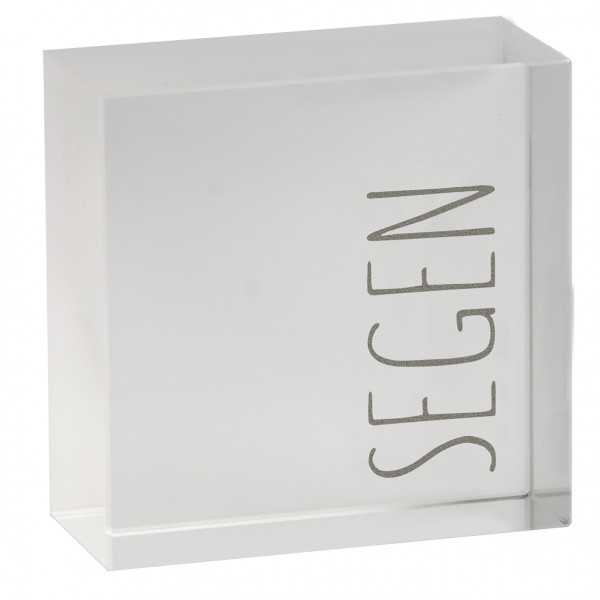 für 29.90€ kaufen ···· religioese-geschenke.de Kristallglas-Objekt Glasquader Größe: 6,7 x 6,7 x 3 cm Farbe: Durchsichtig Rückseite satiniert Verarbeitung: Rückseitiger Aufdruck Botschaft: SEGEN Lieferung in einer Geschenkverpackung Mit Expertise ····· 101425026· 1 ·