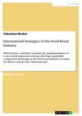 ····· lezzter Preis 17.99€ ···· Rheinberg-Buch.de - Bücher, eBooks, DVD & Blu-ray Bachelor Thesis from the year 2008 in the subject Business economics - Trade and Distribution, grade: 1, European Business School London / Regent`s College, language: English, abstract: This research is concerned with the evaluation of factors that contribute towards sustainable competitive advantage in the food retail sector in China. Increasing globalisation encounters problems to market particularities from the macro and micro point of view. This research emphasises on the evaluation of political, economical, social, technological, ecological, and legal factors, the market attractiveness based on the bargaining powers of buyers and suppliers, the transformation of resources into capabilities, and the creation of value along the supply chain of key international market players. The research is undertaken on the bases of cutting edge literature, articles, and journals. It is enriched by the use of primary research in the form of an interview with the general manager of Metro Cash & Carry, the world`s largest self service food and non food retailer. Contemporary studies have been conducted through online sources. The contributing factors for a successful strategic alignment in China are economies of scale and scope. This has been gathered from the analysis and encompasses t the product range and the store format adaptability and excellent procurement logistics with regards to strong supplier relationship management. The store format adaptability arises from excellent local supplier relationship for optimized product fit. The implications of this research derive recommendations in the area of quality and freshness of product assortment, excellent global procurement logistics, political negotiation powers, and organic growth for sustainable competitive advantage for future expansion. ····· 10361190525