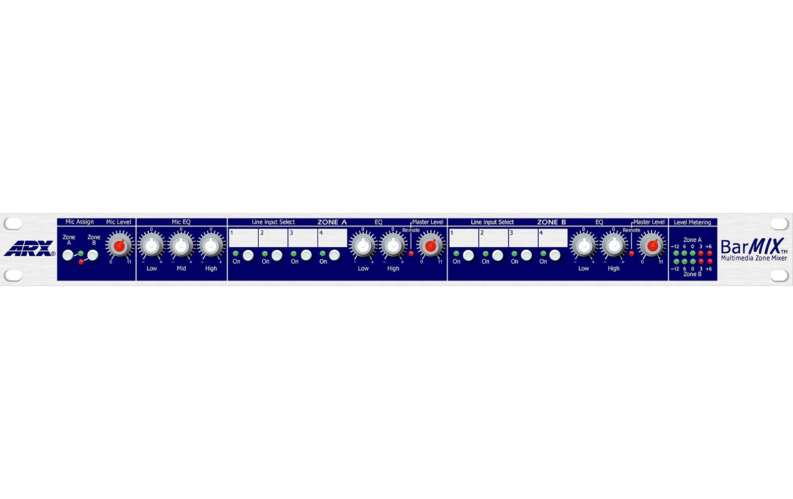 ARX BarMix: Mikrofoneingang schaltbar auf einzelne oder beide Zonen mit Prioritäten- und `push to talk` Funktion. 3-Band EQ für Mikrofoneingang und 2-Band EQ für Zonenausgänge. Lautstärke für beide Zonen über VCA fernsteuerbar.Features:4x stereo RC