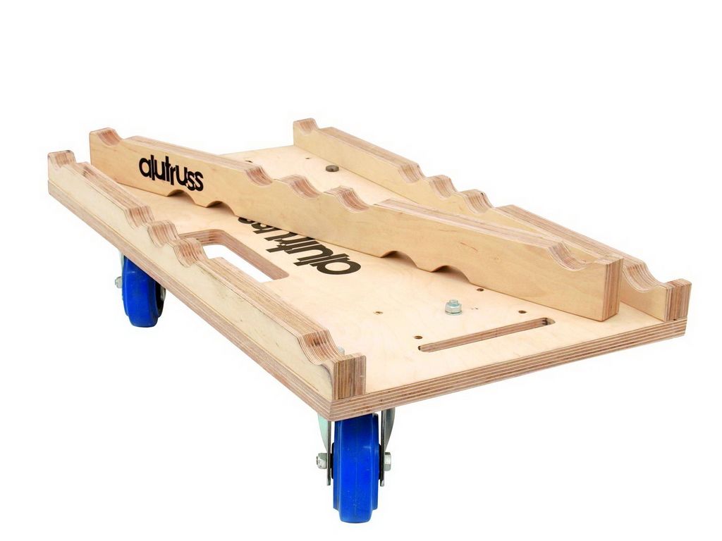 20: Alutruss Trusstransport-Wagen TRIO inkl. 3 Rollen: Features: Praktischer Transportwagen aus Multiplexholz (23 mm)Geeignet für 3 TRILOCK-Traversen mit 290 mm AußenmaßUnkompliziertes und sicheres Stapeln mit separat erhältlichen StapelleistenGriffloch u