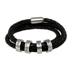 20: Echtlederarmband, braun oder schwarz, geflochten, mit 4 runden Namens-Elementen, dreifach gewickelt mit Edelstahl Magnetverschluß
