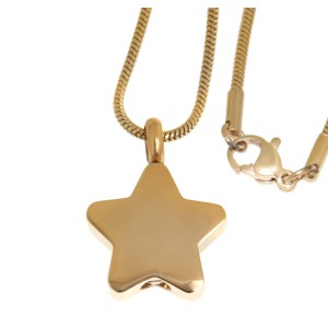 Asche Anhänger Stern Gold aus Edelstahl Hochglanz poliert. Höhe inkl. Öse 25.2mm, Breite 18.8mm, der Artikel ist 6mm stark. Der Anhänger wird mit einer 50cm Stahlkette und in einer Geschenkverpackung geliefert. Inklusive Trichter und Edelstahl Nadel zum befüllen.