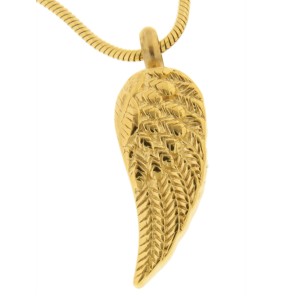 Ascheschmuck Asche Anhänger Flügel aus Edelstahl gold Hochglanz poliert. Höhe inkl. Öse 34.8mm, Breite 11.8mm, der Artikel ist 6mm stark. Der Anhänger wird mit einer 50cm Stahlkette und in einer Geschenkverpackung geliefert. Inklusive Trichter und Edelstahl Nadel zum befüllen.