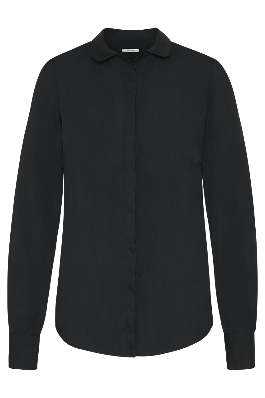 Simpel und elegant. Diese Bluse bekommt durch ihren Bubi Kragen das gewisse Etwas verliehen und bleibt dennoch klassisch mit ihrer verdeckten Knopfleiste und dem langen Arm. Das zarte Gewebe aus TENCEL schmiegt sich glatt dem Körper an.