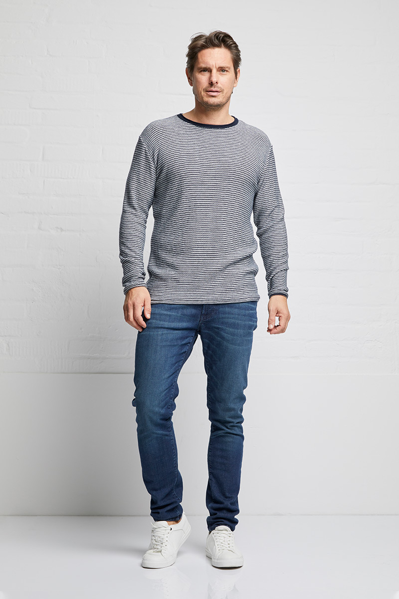 ··· Unser beliebter Crewknit Open Edge mit maritimem Streifenmuster. Der leichte Strick aus 100% Biobaumwolle ist ideal für Übergangszeit oder an kühlen Sommerabenden. Die offenen" Rollbündchen sind die besonderen Details dieses schlicht schönen Pullovers. Unser Model trägt die Größe L.