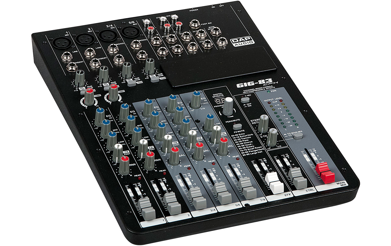 20: DAP GIG-83CFX: Das GIG-83 CFX Mischpult verfügt über Funktionen, die bei anderen Pulten seiner Größe vergeblich zu suchen sind: 4 Mono-Eingänge (mit besonders geräuscharmen Mikrofon-Vorverstärkern und Phantomspeisung von +48 Volt) und 3 Stereo-Eing