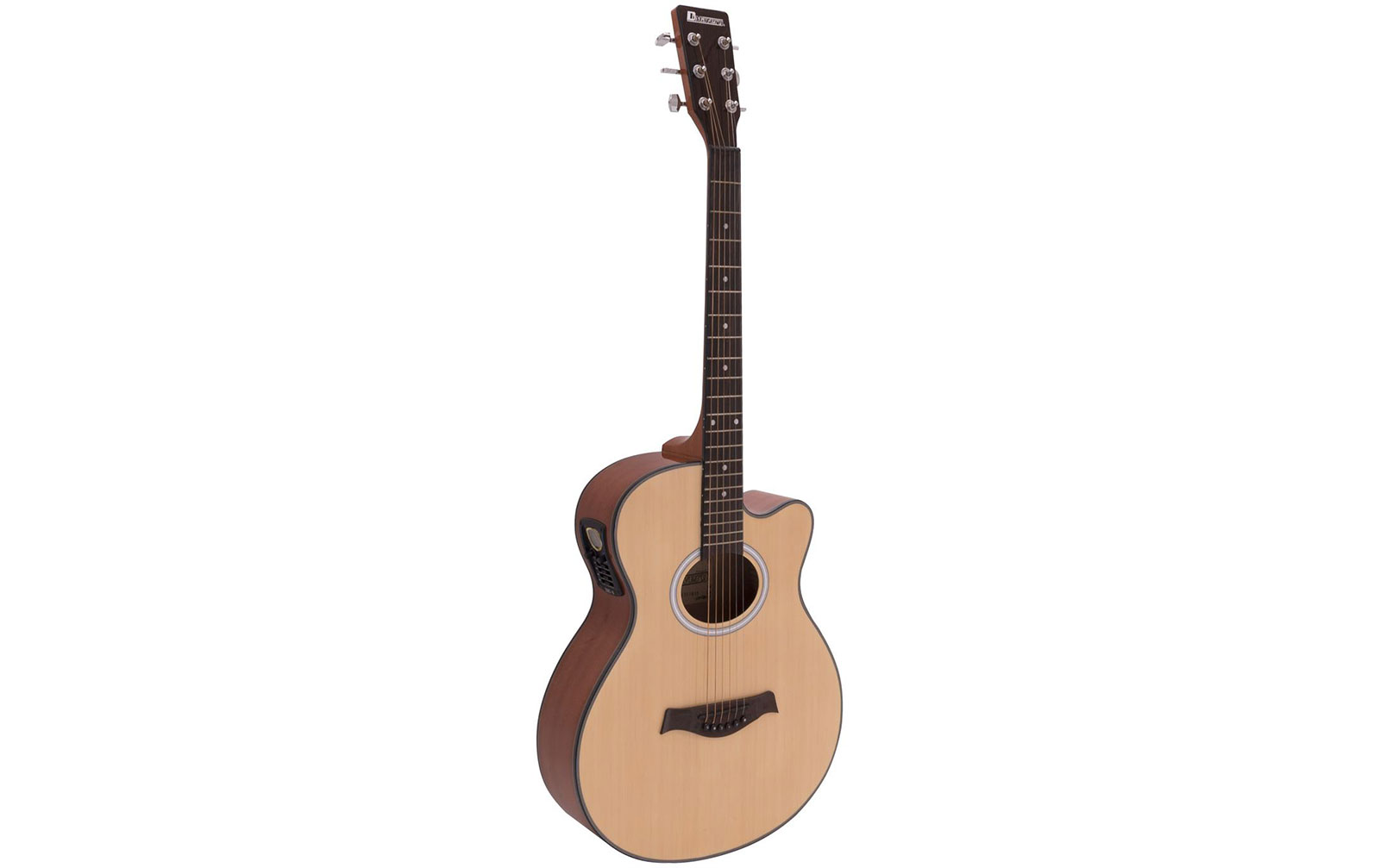 Dimavery AW-400 Western-Gitarre, natur: Features:Farbe: natur Decke: Fichte Korpus: Sapele Hals: Nato Griffbrett: Palisander, 21 Bünde Brücke: Palisander Mensur: 650 mm Sattelbreite: 45 mm Inkl. Tonabnehmersystem mit 3-Band-EQ und Tuner Versandgewicht:
