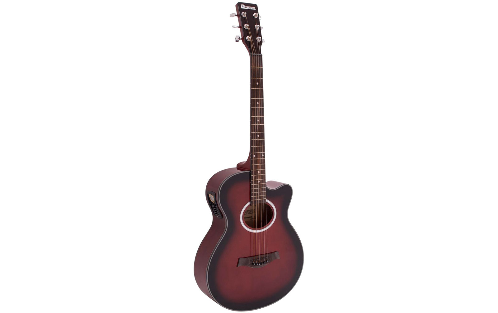 20: Dimavery AW-400 Western-Gitarre, redburst: Features:Farbe: redburst Decke: Fichte Korpus: Sapele Hals: Nato Griffbrett: Palisander, 21 Bünde Brücke: Palisander Mensur: 650 mm Sattelbreite: 45 mm Inkl. Tonabnehmersystem mit 3-Band-EQ und Tuner Versandgew