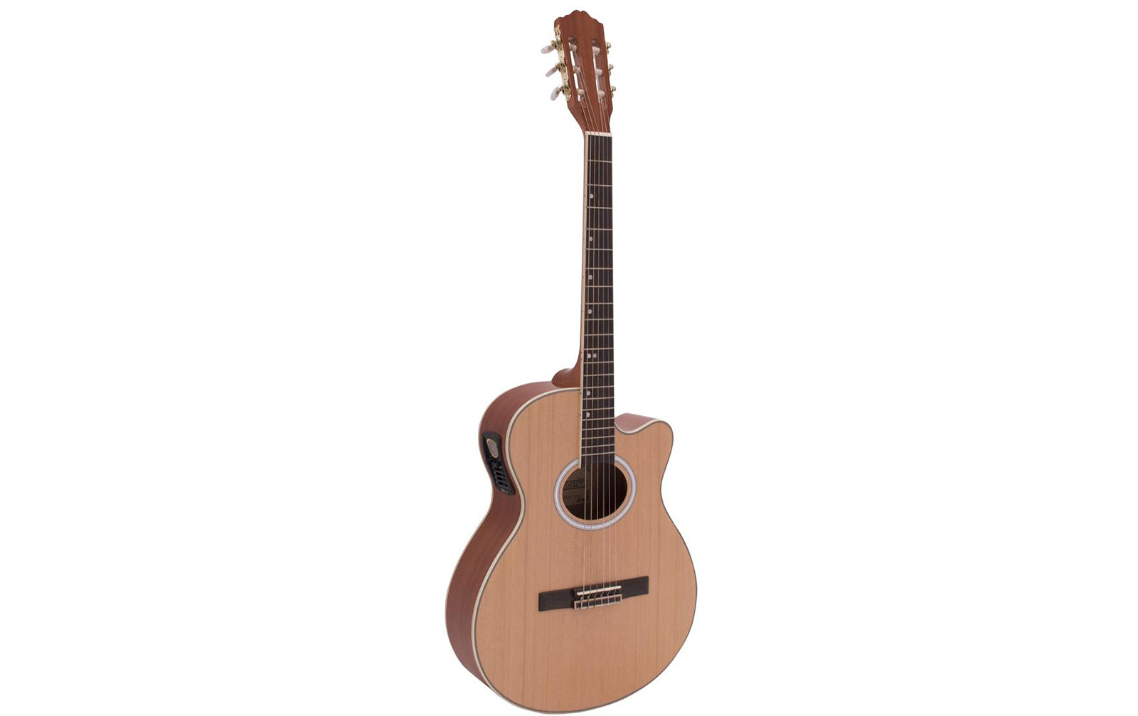 Dimavery CN-500 Klassik-Gitarre, natur: Features:Farbe: natur Korpus: Mahagoni, mit Cutaway Hals: Nato Griffbrett: Palisander Brücke: Palisander Mensur: 650 mm Sattelbreite: 50 mm Inkl. Tonabnehmersystem mit 3-Band-EQ und Tuner Versandgewicht: 2,65 kg In