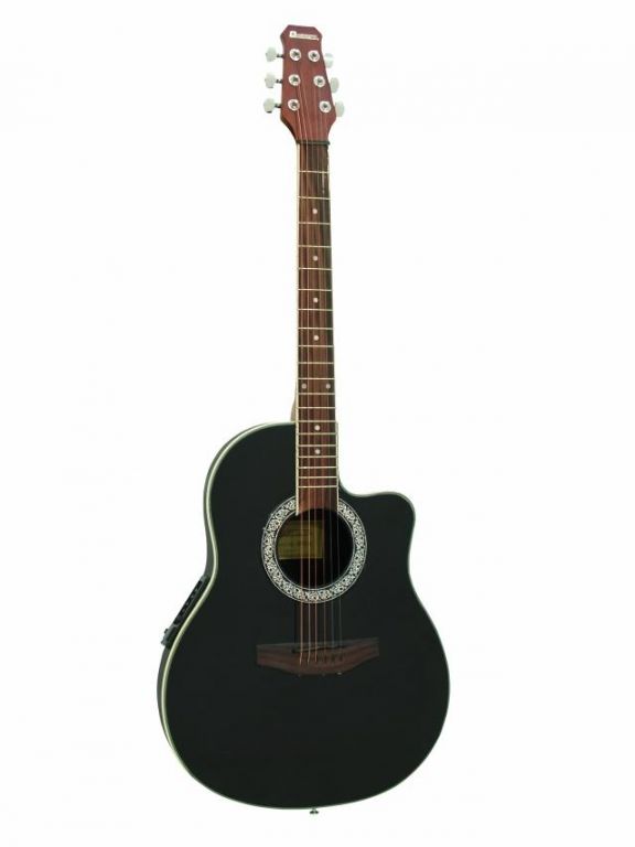 Dimavery RB-300 Roundback, schwarz gefl.: Features: Farbe: schwarz geflammtKorpus: Roundback mit CutawayDecke: FichteBrücke: PalisanderHals: AhornGriffbrett: Palisander, 21 BündeHardware: verchromtVorverstärker mit 3-Band-Equalizer und Präsenz-Regler