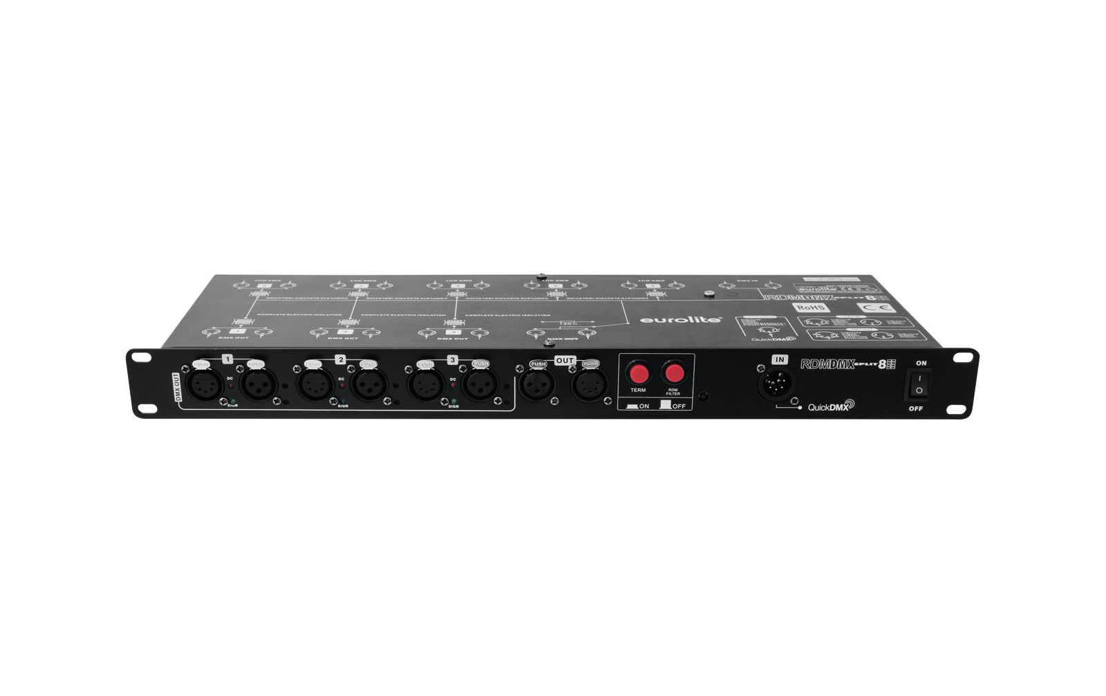 Eurolite DMX Split 8X RDM Splitter: Features:DMX-Verteiler für die Aufteilung eines DMX-Eingangssignals auf 8 DMX-Ausgänge Anschlüsse: 1 x DMX-Eingang, 1x DMX-Durchschleifausgang, 8 x DMX-Ausgang Zusätzlicher QuickDMX-Eingang für den drahtlosen Empfa