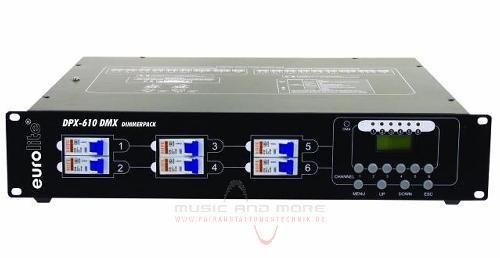 20: Eurolite DPX-610 DMX 19 Zoll Dimmerpack: Features:Universale Lichtendstufe für professionellen Einsatz Kann sowohl einphasig als auch dreiphasig betrieben werden 6 x 10 A Sowohl DMX-Steuerung als auch analoge Steuerung möglich Die DMX-Startadresse läss