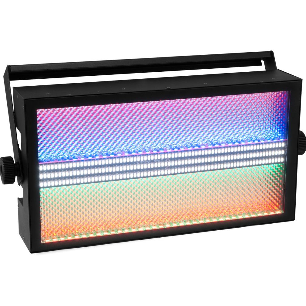 Eurolite LED Super Strobe ABL: Features:3 Effekte in einem Gerät: Stroboskop, Blinder und Ambientlight 216 kaltweiße LEDs (SMD 5730) für schnelle, dynamische Strobe- und Blinder-Effekte 144 zusätzliche RGB-LEDs (SMD 5050) sorgen für ein angenehmes St