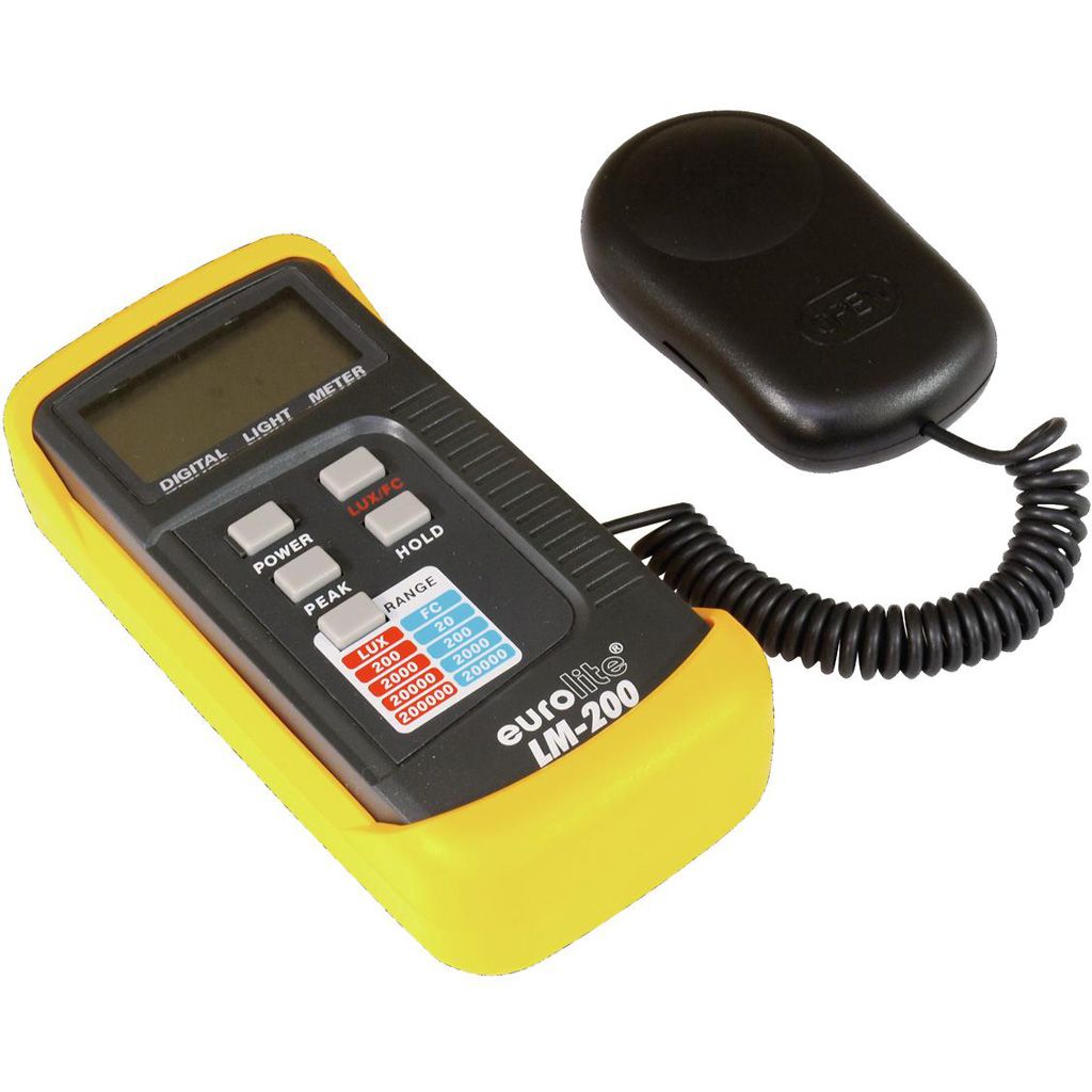 Eurolite LM-200 Luxmeter: Features:Große, präzise 3 ½-stellige LCD-Anzeige Angabe in den Maßeinheiten Lux und Foot Candle möglich 4 wählbare Messbereiche von 0-200.000 Lux oder 0-20.000 Foot Candle Automatische Nullstellung Messwert-Haltefunktion (D