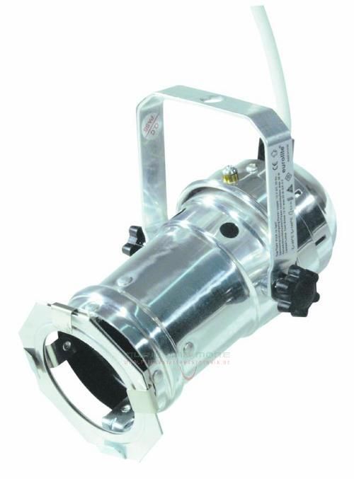 20: Eurolite PAR-16 Spot GU-10 silber: Features:Mini-Scheinwerfer für GU-10 LampeCa. 15 cm LängeBetriebsspannung 230 V - ohne TrafoZugelassen bis maximal 75 W LampenleistungFarbfilter können vorgesetzt werden Technische Daten:Spannungsversorgung: 230 V AC,