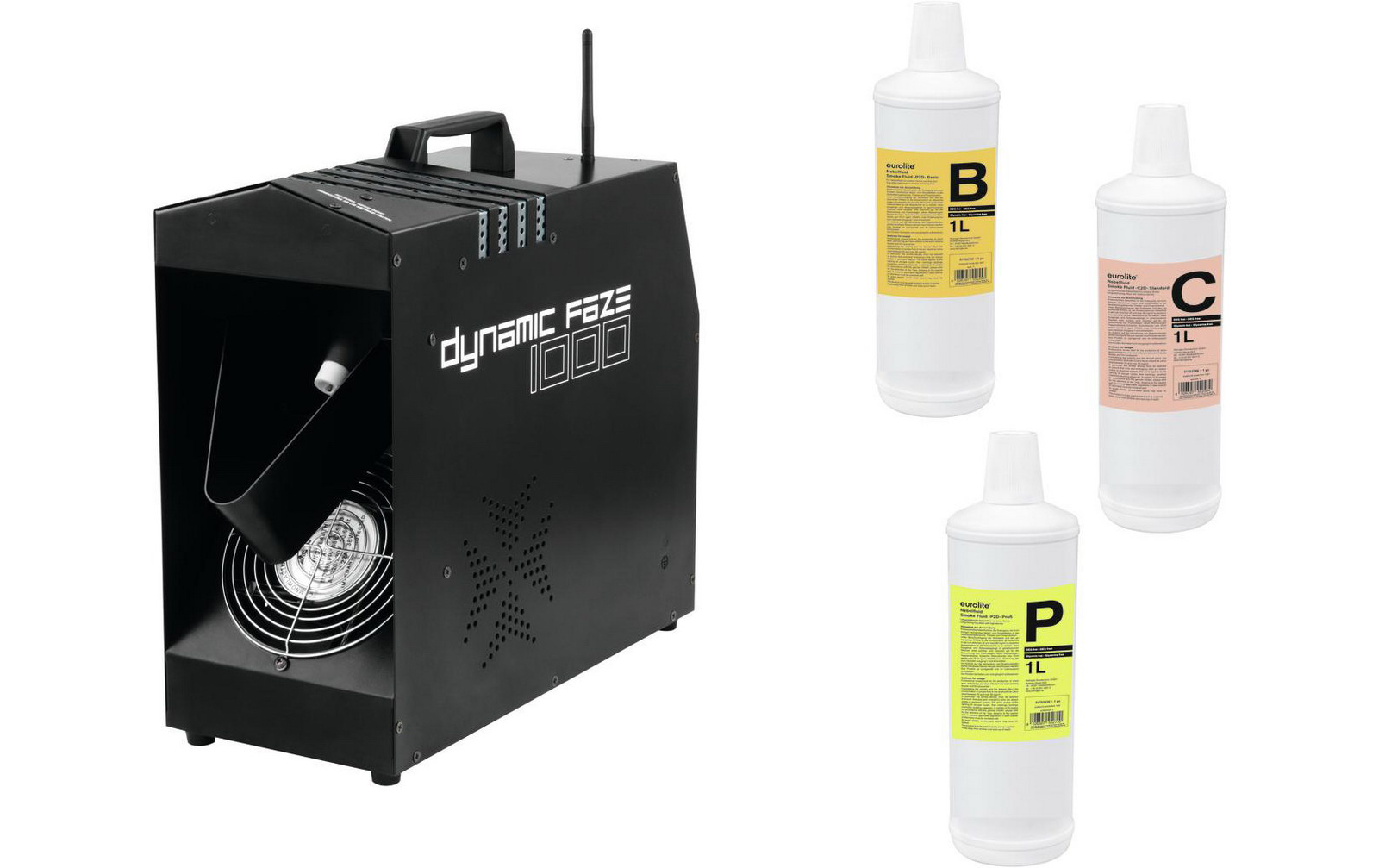 20: Eurolite Set Dynamic Faze 1000 + Fluide: Set bestehend aus: 1x 51702057: EUROLITE Dynamic Faze 1000 Dunstnebelmaschine 1x 51703750: EUROLITE Smoke Fluid -B2D- Basic Nebelfluid 1l 1x 51703796: EUROLITE Smoke Fluid -C2D- Standard Nebelfluid 1l 1x 51703830: