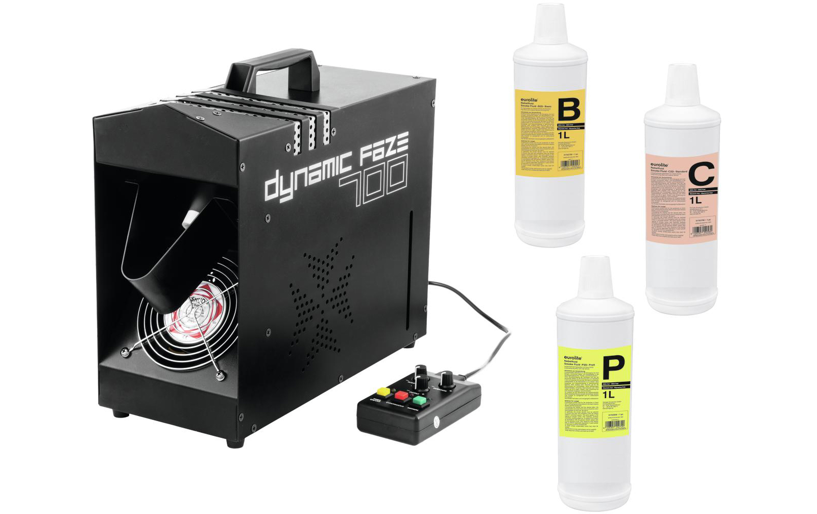 Eurolite Set Dynamic Faze 700 + Fluide: Set bestehend aus: 1x 51702055: EUROLITE Dynamic Faze 700 Dunstnebelmaschine 1x 51703750: EUROLITE Smoke Fluid -B2D- Basic Nebelfluid 1l 1x 51703796: EUROLITE Smoke Fluid -C2D- Standard Nebelfluid 1l 1x 51703830: EU