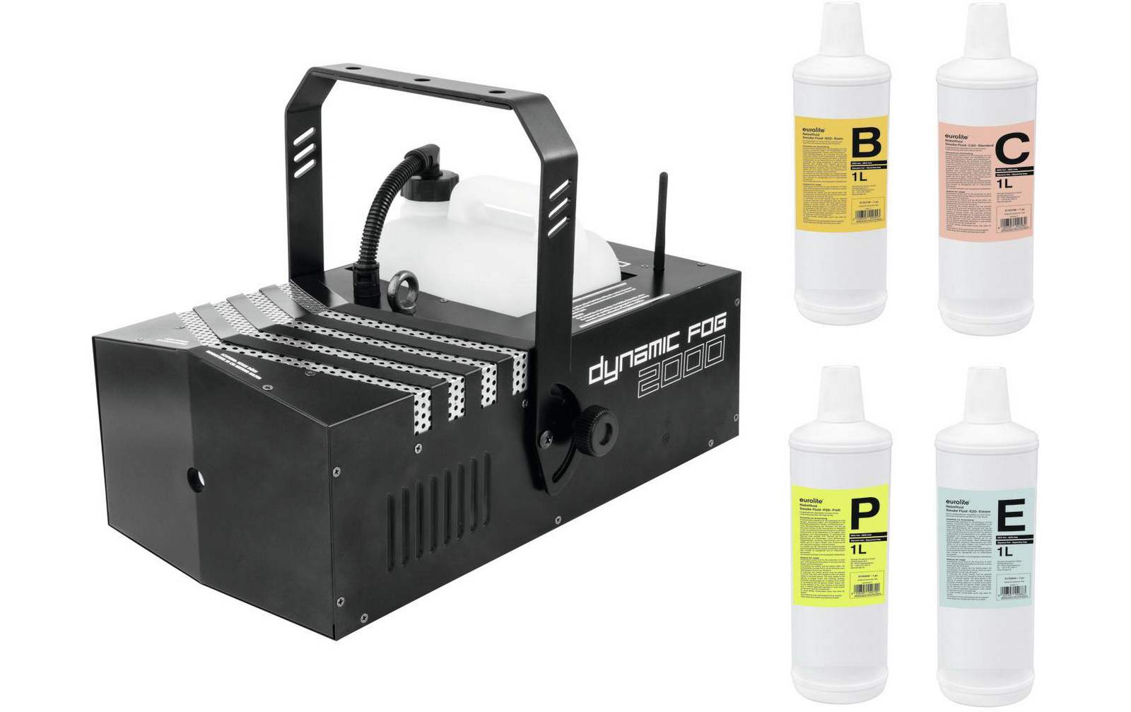Eurolite Set Dynamic Fog 2000 + Fluide: Set bestehend aus: 1x 51702050: EUROLITE Dynamic Fog 2000 Nebelmaschine 1x 51703750: EUROLITE Smoke Fluid -B2D- Basic Nebelfluid 1l 1x 51703796: EUROLITE Smoke Fluid -C2D- Standard Nebelfluid 1l 1x 51703830: EUROLIT