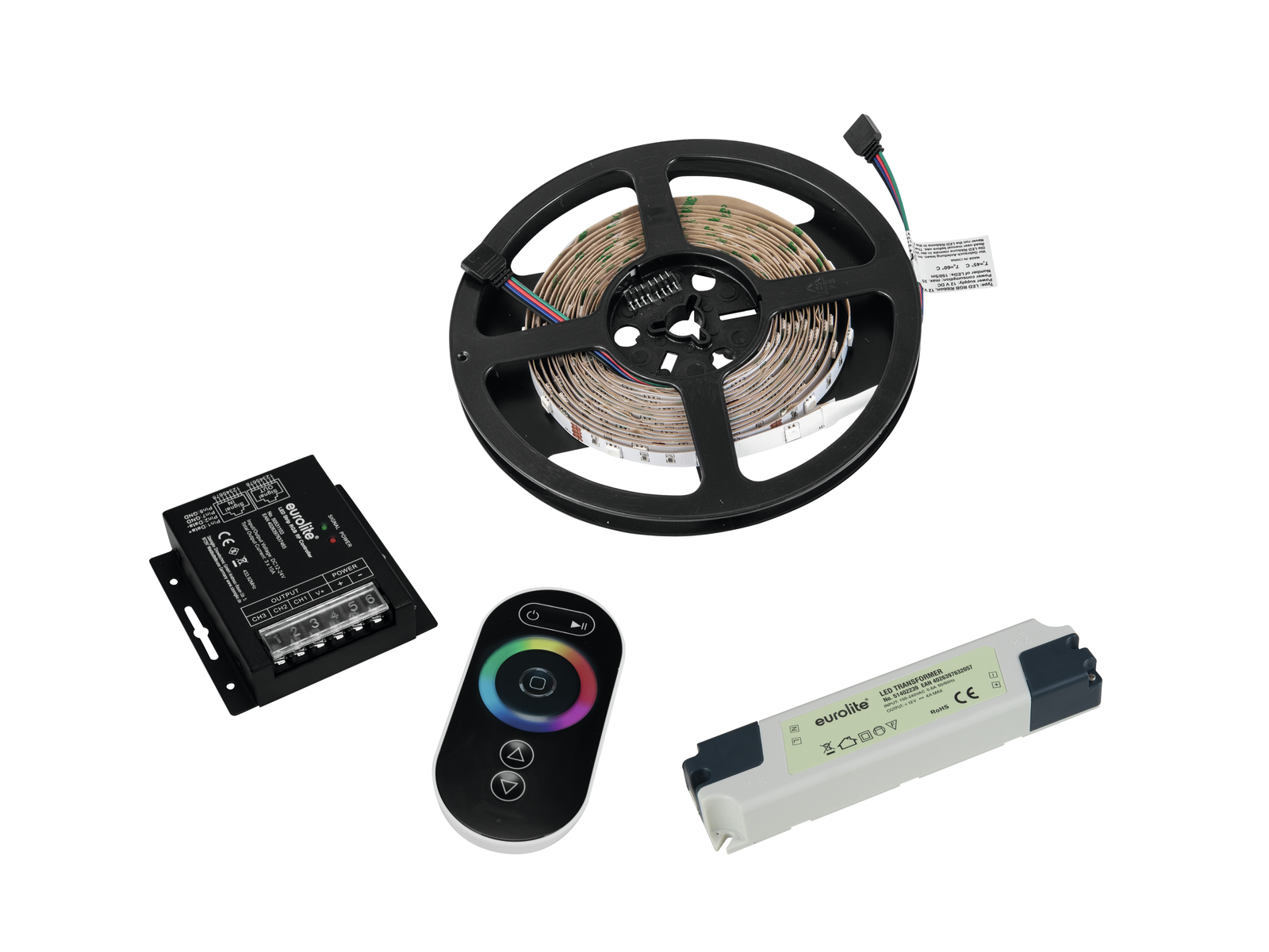 Eurolite Set LED Strip RGB 5m + RF Controller + Trafo 24V: Set bestehend aus:1x: EUROLITE LED Strip 150 5m 5050 RGB 12V1x: EUROLITE LED Strip RGB RF Controller1x: EUROLITE Elektronischer LED Trafo, 12V, 4AEurolite bietet mit seinen zahlreichen LED Streife