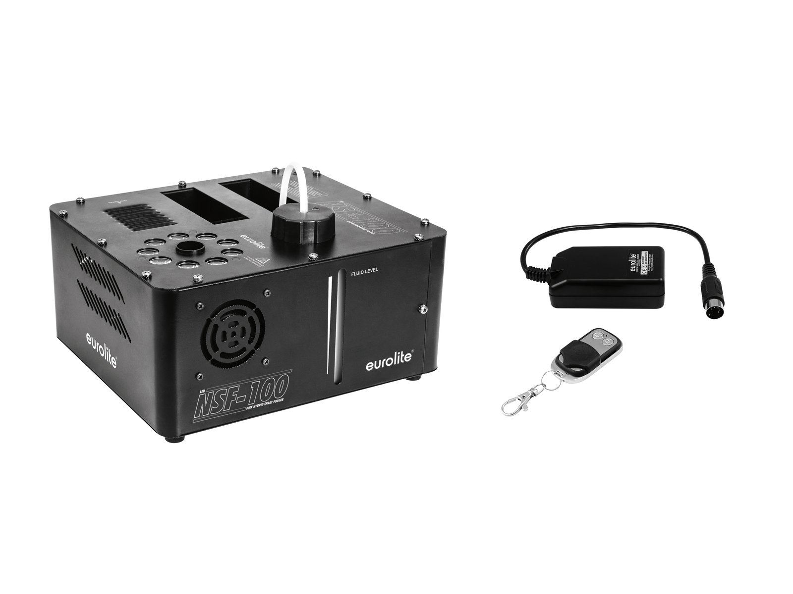 20: Eurolite Set NSF-100 LED DMX Hybrid Spray Fogger + WRC-4 Funkfer: Set bestehend aus:1x: EUROLITE NSF-100 LED DMX Hybrid Spray Fogger1x: EUROLITE WRC-4 Funkfernbedienung mit EmpfängerFeatures:Eurolite NSF-100 LED DMX Hybrid Spray Fogger DMX-Nebelmaschine