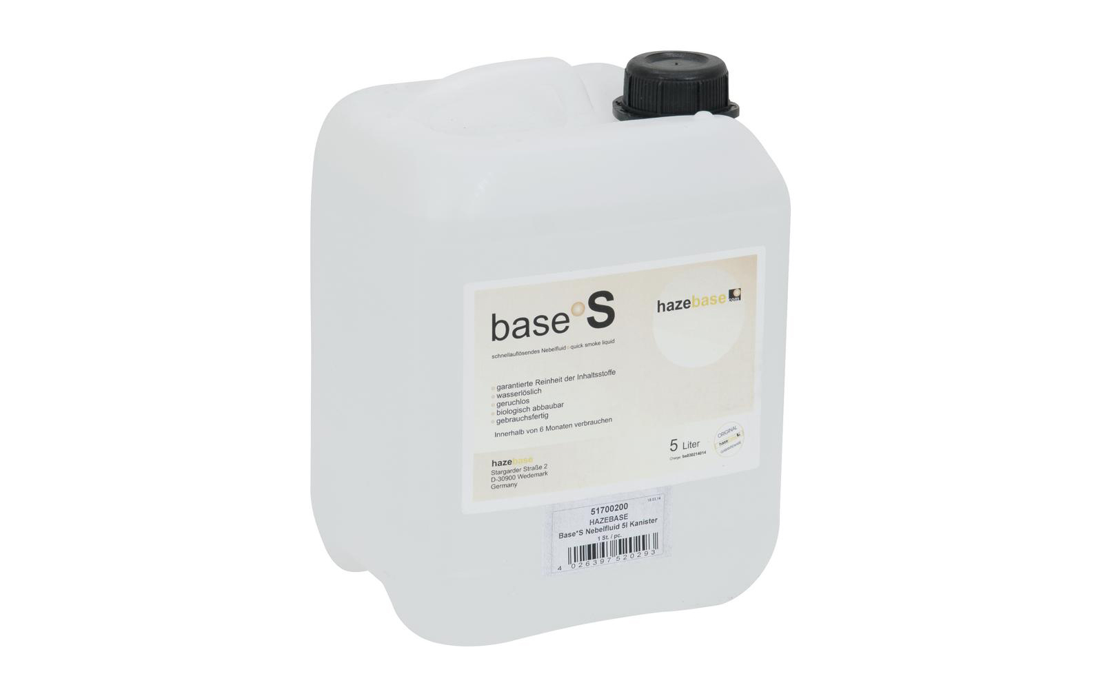 Hazebase Base*S Nebelfluid 25l Kanister: Features:Auf Wasserbasis Geruchsneutral Toxikologisch unbedenklich Nicht gesundheitsschädlich Kanister wiederverwendbar Biologisch leicht abbaubar Nicht entzündlich Unterliegt ständiger Kontrolle Made in Germany