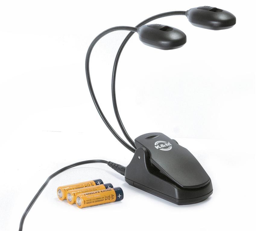 20: K&M 12270 Notenpultleuchte »Twin Head«: Durch die äußerst beweglichen Schwanenhälse kann der Musiker je nach Wunsch sehr fokussiertes oder auch flächiges Licht einstellen. Jeder Kopf enthält einen Viererpack LEDs, die unabhängig von einander gesch