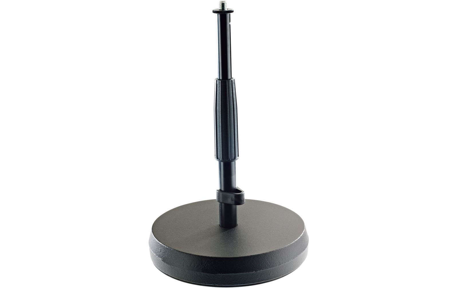 K&M 23325 Tisch- / Bodenstativ, schwarz: Niedriges Stativ mit platzsparendem Gusssockel. Bestens geeignet als Tischstativ oder zur Mikrofonierung von Amps, Percussion, etc. Die umlaufende trittschalldämpfende Gummieinlage vermeidet unerwünschte Übertra