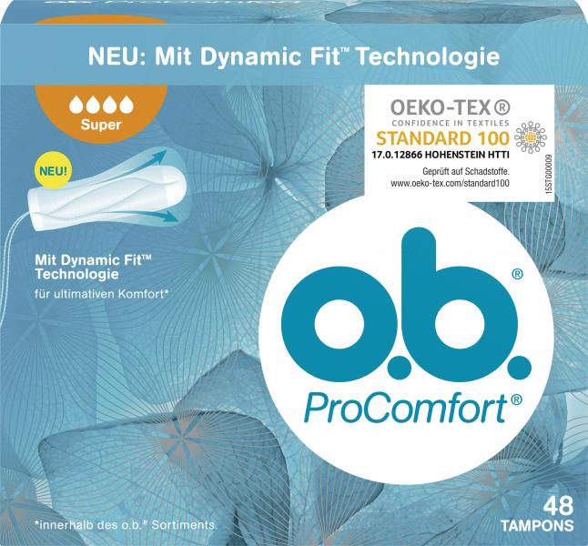 20: NEU: o.b.® ProComfort® mit Dynamic FitTM Technologie und SilkTouch® Oberfläche für ultimativen Komfort* und zuverlässigen Schutz. 3D Entfaltung sorgt für ein natürliches Anpassen des Tampons an den Körper. Einzigartige ineinander greifende Rillen helfen die Flüssigkeit effizient im Inneren des Tampons zu verteilen. Mit SilkTouch® Oberfläche für besonders leichtes Einführen und Entfernen.
