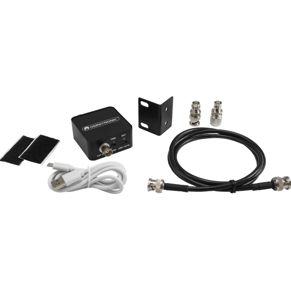 20: Omnitronic AAB-10 Antennenverstärker, aktiv, batteriebetrieben: Features:470-930 MHz Signalverstärkung um +10 dB 2 x BNC-Anschluss Lithium-Ionen-Akku mit bis zu 6 Stunden Betriebszeit Aluminiumgehäuse Ein-/Ausschalter Laden per Micro-USB-Schnittstelle