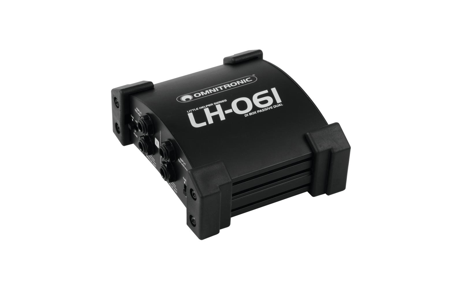 20: Omnitronic LH-061 PRO Duale DI-Box passiv: Features:Passive 2-Kanal-DI-Box mit Split-Modus 2 hochohmige Signaleingänge über zwei 6,3-mm-Klinke-Buchsen 2 niederohmige XLR-Ausgänge 2 Durchschleifausgänge (6,3-mm-Klinke) Wandelt 2 separate unsymmetrische