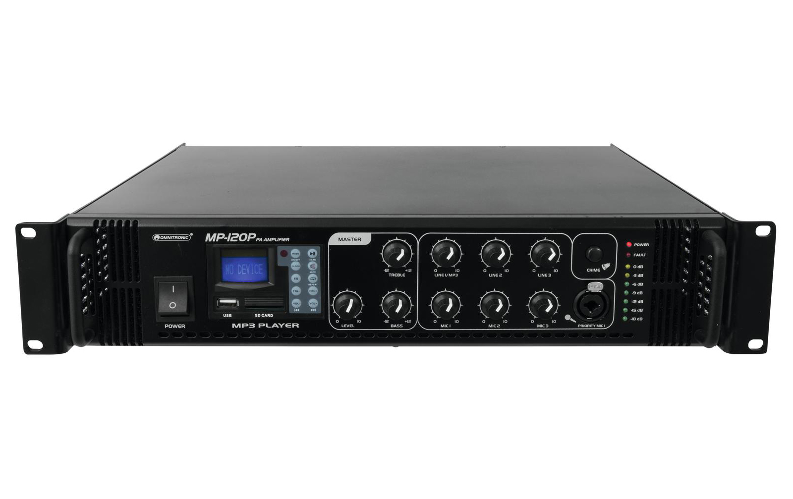 20: Omnitronic MP-120P ELA-Mischverstärker: Features:Anschluss für 70-V- oder 100-V-ELA-Lausprecher oder für niederohmige Lautsprecher (4-16 Ohm) MP3-Player mit IR-Fernbedienung und blau hinterleuchteter LCD-Anzeige SD-Kartensteckplatz und USB-Anschluss Or