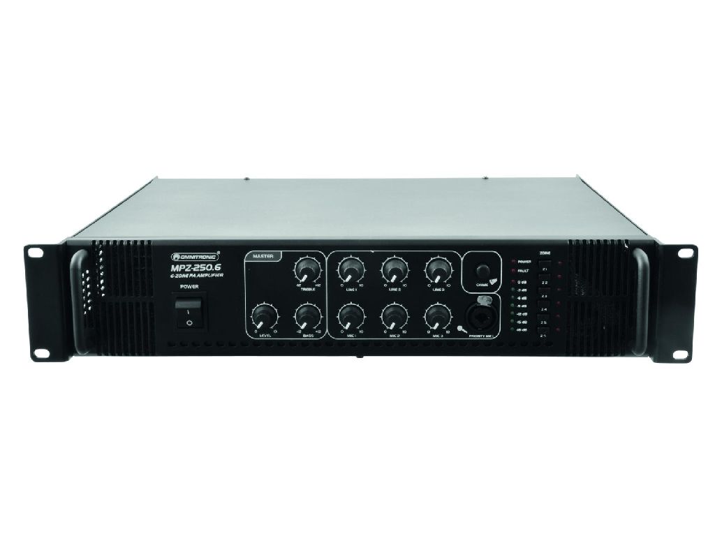 20: Omnitronic MPZ-250.6 Mischverstärker: Features: Komfortable Ansteuerung für ELA-Lautsprecher über 6-Zonen-Technik6 ELA-Zonenausgänge (100 V), separat schaltbar auf der FrontplatteMaster-ELA-Lautsprecherausgang (70 und 100 V)Anschlussmöglichkeit für
