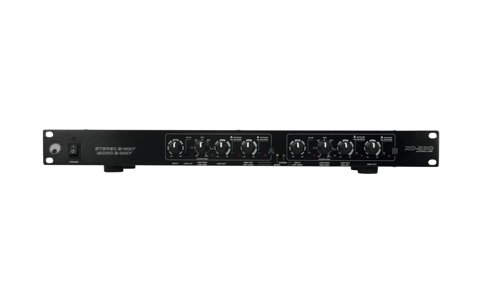 Omnitronic XO-230 Aktive Frequenzweiche: Features:2-Wege-Stereo- oder 3-Wege-Mono-Betrieb 24 dB Flankensteilheit/Oktave Ausgangspegel für jeden Frequenzbereich einzeln regelbar Trennfrequenz regelbar Low-Cut-Schalter Phasenlage umschaltbar XLR-Eingänge