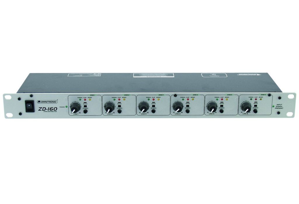 20: Omnitronic ZD-160 Zonen-Verteiler: Features: Erweitert jedes Mischpult im Line-BereichXLR-EingangLautstärkeregler je ZoneSechs Zonen-Ausgänge über XLR-BuchsenJede Zone lässt sich individuell auf mono umschaltenLED-Anzeige für Signaleingang und mono/s