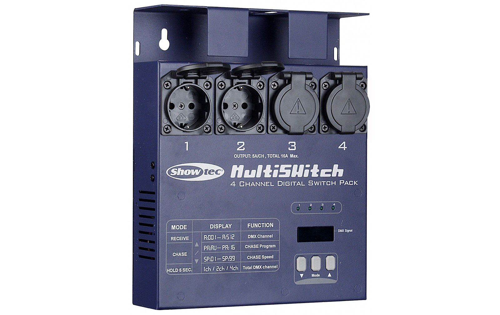 20: Showtec MultiSwitch: Technische Daten:Anschluss: 3p XLR male & female Kanal-Output: 5A / CH., Total 16A.Licht, Effekte & Video > Steuerpulte & Controller > Kompakt Steuergeräte