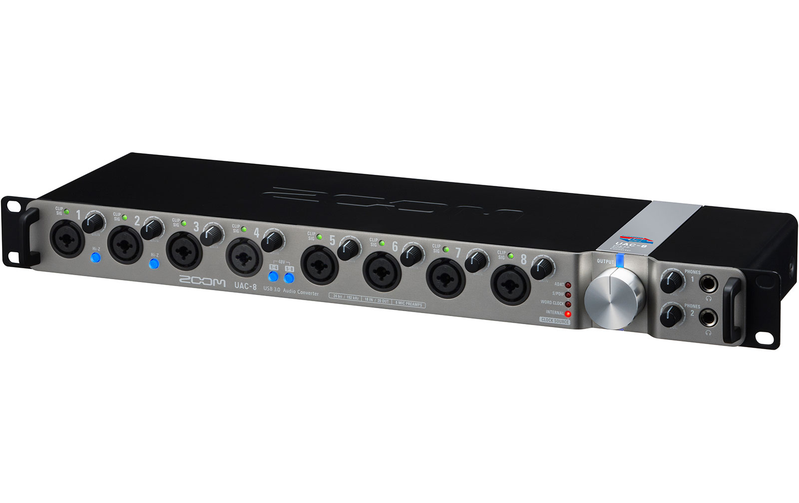 20: Zoom UAC-8: Features:USB 3.0 Audio Interface Wandlung mit bis zu 24 Bit & 192 kHz Eingänge: 8 × XLR/Klinke, Inputs 1 & 2 wahlweise Hi-Z Phantomspannung (48 Volt) für Inputs 1-4 & 5-8 zuschaltbar Ausgänge: 8 × 6,3 mm + 2 × 6,3 mm (Main) Kopfhörer: 2