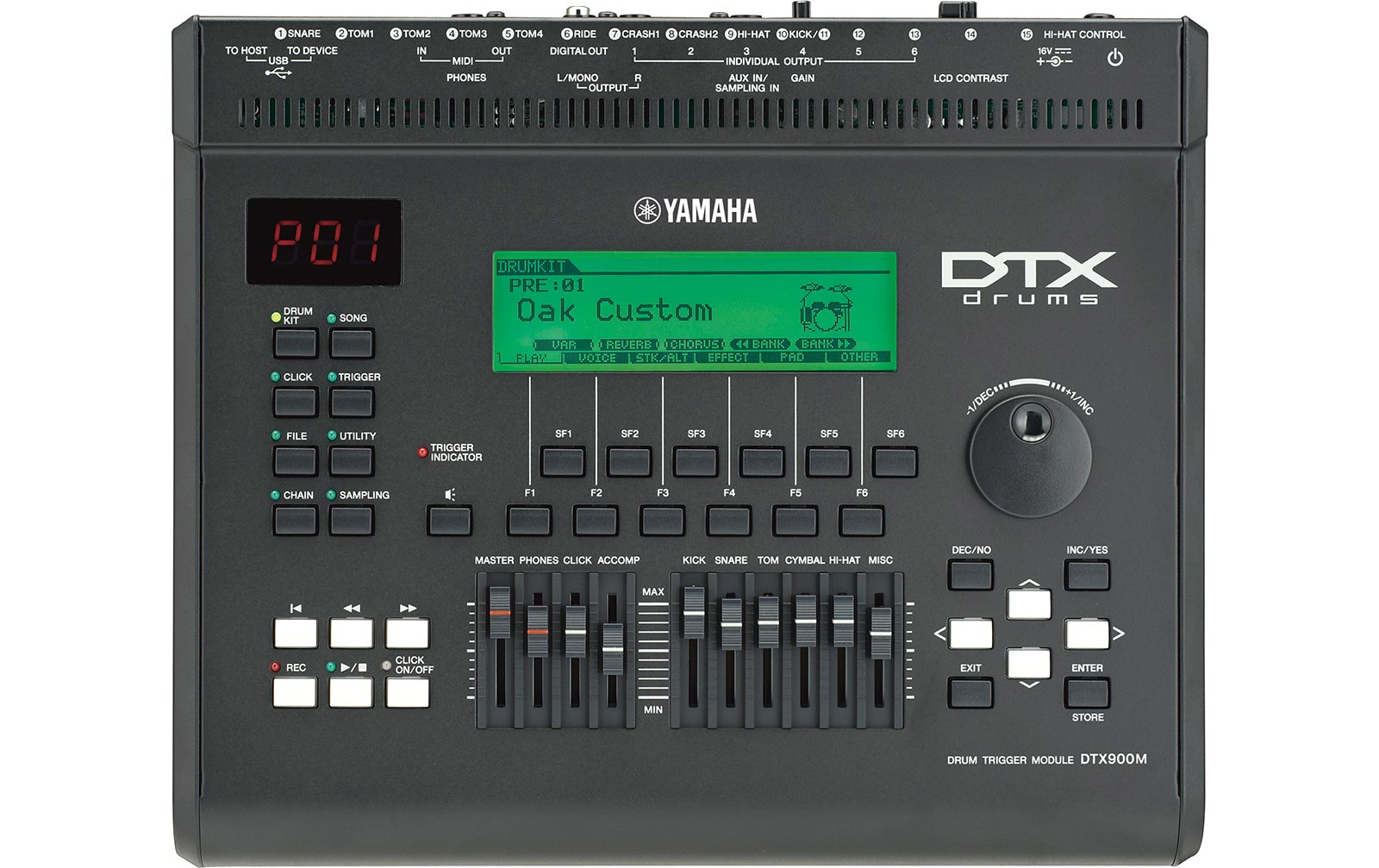 Yamaha DTX900M Drummodul: Features:512 MB Sample-RAM ab Werk1115 Voices, 64-fache Polyphonie, 50 Preset Drum Kits, 50 User Drum Kits, bis zu 1.584 External User Kits (von USB-Stick)211 melodische Sounds (GM)USB to DEVICE/to HOST, S/P-DIF Ausgang, 6 Indivi